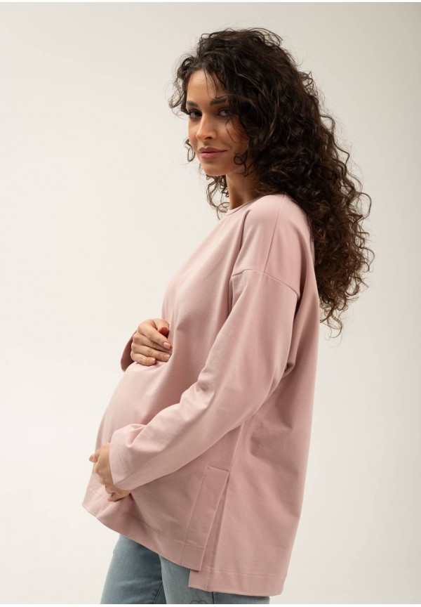 Джемпер для беременных универсального свободного кроя с разрезами по бокам и спущенным плечом в стиле оверсайз.