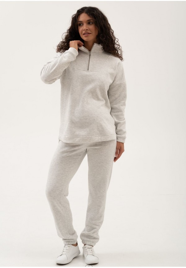 Джемпер для беременных свободного силуэта со спущенным плечом, разноуровневым подолом с разрезами и воротником-стойкой на молнии, Спортивные брюки для беременных с резинкой по низу.