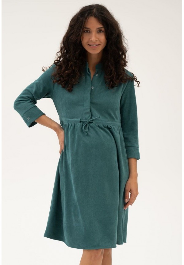 Под грудью заложен защип для растущего животика. Благодаря съёмному поясу, можно подчеркнуть талию или носить после беременности. Рукава 3/4 застегиваются на пату, длину рукава можно регулировать.