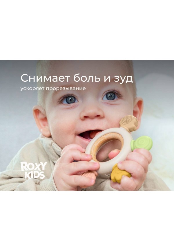 Прорезыватель выполнен из безопасных гипоаллергенных материалов — мягкого пищевого силикона и натурального бука.