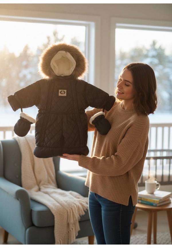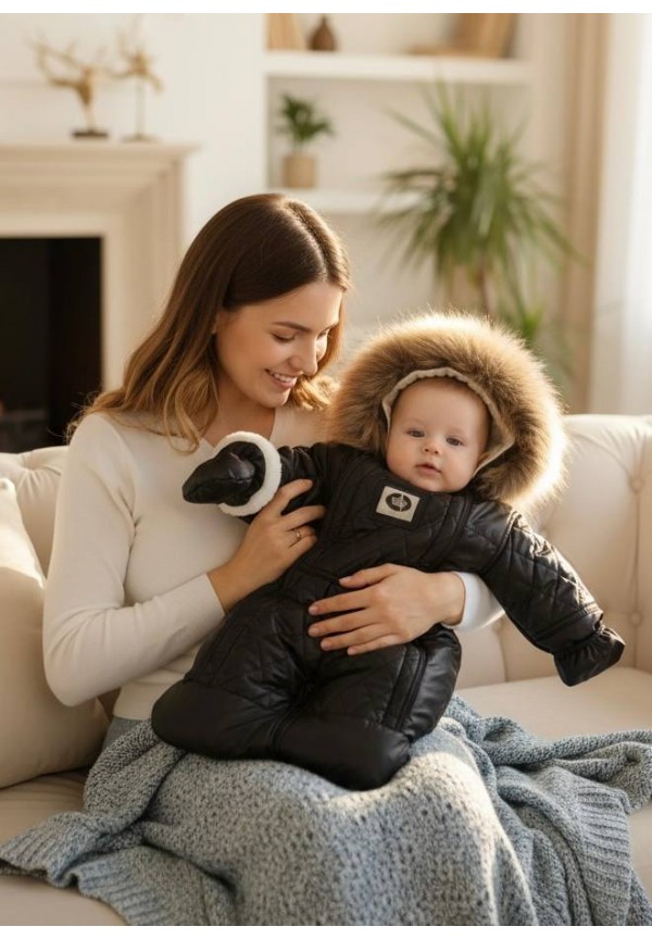 Вам не придется искать дополнительные аксессуары – все уже включено. Утепленные рукавички (варежки) на овчине сохраняют ручки малыша в тепле. Теплые пинетки (ботиночки) на овчине защищают ножки в режиме комбинезона.